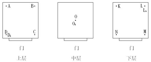 在被恒溫恒濕試驗箱工作室內(nèi)定出上、中、下三個水平層面(簡稱上、中、下三層),上層與工作室頂面的距離是工作室高度的1/10,中層通過工作室?guī)缀沃行狞cO,下層在底層樣品架上方10mm處。 恒溫恒濕試驗箱測量點分別位于上、中、下三層,如圖1和圖2。 溫度測量點用O、A、B、C、D、E、F、G、H、J、K、L、M、N、U表示。 相對濕度測量點用Oh、Dh、Hh、Lh表示。 工作室容積不大于2m3時,溫度測量點為9個,相對濕度測量點為3個