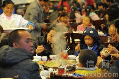 室外雪下得正“High”,火鍋店里卻熱火朝天。華昌路上重慶老火鍋店的楊老板中午特意叫伙計(jì)加夠了客人愛點(diǎn)的豌豆尖、大白菜等!氨茸蛱於噘I了一倍!睏罾习逭f,近段時(shí)間每天的菜金也就300元左右,昨天他把菜金提高了一倍,還不到6點(diǎn)半,店里所有的桌子全部坐滿。