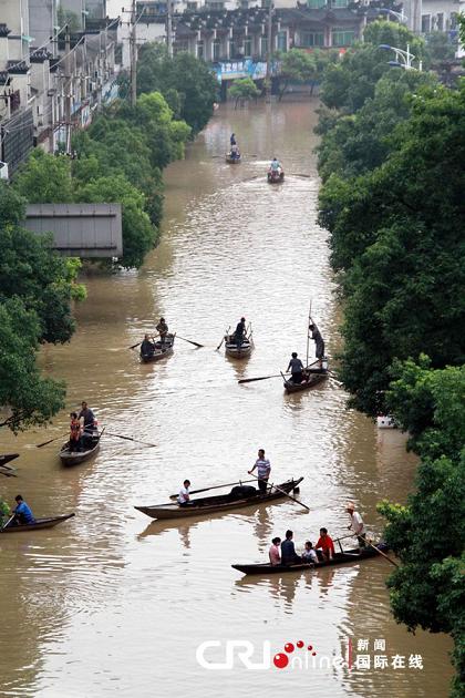 2011年6月20日,浙江蘭溪城里東門至南門路段水漫金山,市民坐船出行。水面上數(shù)只小木船構(gòu)成城市版“江南水鄉(xiāng)”。 受6月以來的第四輪強(qiáng)降雨影響,浙江蘭溪2011年6月20日7點(diǎn)30分迎來了自1955年以來的最大洪峰,達(dá)33.73米,超過“6.16”洪峰水位33厘米。據(jù)蘭溪防汛辦提供的數(shù)據(jù),截至上午10點(diǎn),洪峰水位33:68m,超危急水位2.68米,蘭溪抗洪全線告急。 據(jù)記者在蘭溪現(xiàn)場(chǎng)報(bào)告,蘭溪城市內(nèi)澇嚴(yán)重,最深處積水已在1.5米以上,進(jìn)城的幾個(gè)入口都已遭洪水淹沒,蘭溪城內(nèi)已遭洪水圍困,目前交通已經(jīng)中斷,而蘭江干堤低處洪水已漫過干堤。 記者從蘭溪市防汛辦核實(shí),蘭溪市內(nèi)內(nèi)澇嚴(yán)重,蘭溪干堤低處洪水確已漫過干堤。特別是香溪鎮(zhèn)、女埠街道、赤溪街道三個(gè)鄉(xiāng)鎮(zhèn)街道形勢(shì)最為嚴(yán)峻。目前,女埠片下方街道處干堤進(jìn)水嚴(yán)重,下方街道居民住宅進(jìn)水已半層左右,蘭溪市防指已命令巖山片、吳村片、匯潭前方片、女埠片、童家埠片、泉湖片區(qū)域內(nèi)的群眾全部撤離。 目前,蘭溪市上下正嚴(yán)防死守抗此56年來最大洪峰。 約30萬群眾轉(zhuǎn)移 據(jù)初步統(tǒng)計(jì),浙江省已經(jīng)累計(jì)投入搶險(xiǎn)33.6萬人次,機(jī)械14375臺(tái)套、編織袋104.6萬條以及一批沙石料、木材、鋼材等搶險(xiǎn)物資;轉(zhuǎn)移群眾29.2萬人,解救受困群眾1.88萬人. |