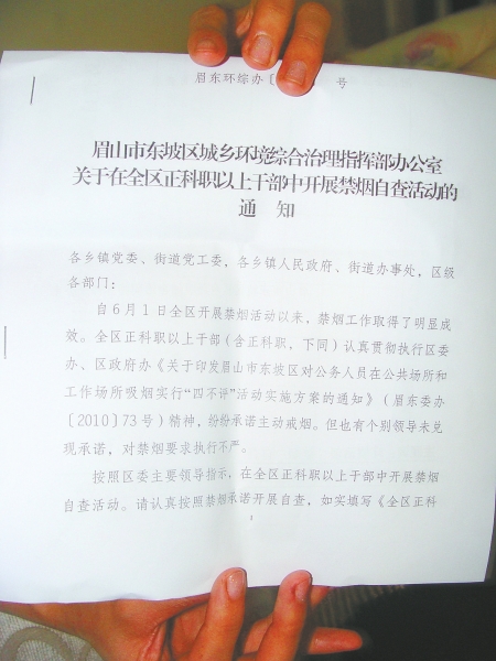 昨日上午,眉山市東坡區(qū)禁煙行動(dòng)辦公室(簡(jiǎn)稱“治理辦”)工作人員正在起草一份關(guān)于禁煙的文件。文件的題目是《眉山市東坡區(qū)城鄉(xiāng)環(huán)境綜合治理指揮部辦公室關(guān)于在全區(qū)正科職以上干部中開展禁煙自查活動(dòng)的通知》,包括幾百字的文字和一份禁煙自查表。